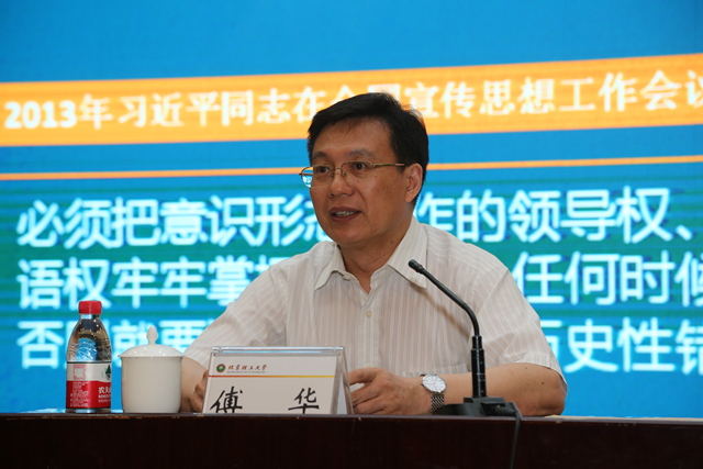 傅华从习近平总书记对意识形态工作的相关论述出发,强调了意识形态工作的重要性,阐述了意识形态的核心内容和社会主义意识形态的特征,介绍了当前意识形态领域面临的形势。围绕“牢牢把握意识形态工作主导权”这个重要命题,傅华提出要从以“中国梦”教育为核心,巩固理想信念,增强民族自信;以文化建设为抓手,凝魂聚气、固本强基;树立“大宣传”理念,共建美丽精神家园,从而不断巩固和发展社会主义意识形态。