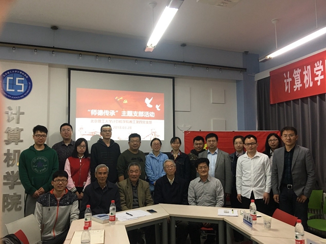 编辑:王雪 审核:蔺伟 阅读次数:作为2017年北京高校党建难点项目——“强化教师党支部功能,落实师德建设和思想政治工作”的试点党支部之一,计算机学院教工第四党支部于2018年3月28日下午组织了“师德传承”主题党日活动。本次活动邀请了吴鹤龄教授、曹元大教授和樊孝忠教授三位计算机学院德高望重的退休老党员、老教师代表与年轻党员们深入交流。校党委组织部部长张笈、计算机学院党委书记蔺伟参加活动。活动由计算机学院教工第四党支部书记祝烈煌教授主持。
