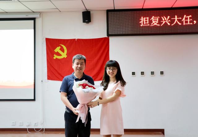 2014级本科第六党支部书记吴佳奕、第四党支部书记牛建林、第二党支部书记黄建开分别向2016级辅导员、本科良乡党支部书记、学生会指导教师李智,低年级党支部书记代表赵人、共产主义学习实践会主席宋汨赠送毕业班党员们精心整理的大学四年的党建和学习资料,共计900M,存放于带有学院logo的定制U盘内。