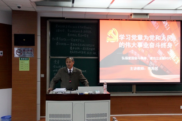 在党课讲述中,李兆民从现实问题出发,向同学们讲授了党章的历史和作用,强调认真学习党章的重要性。他向同学们传达了正确的入党动机以及作为一名合格的共产党员应该以何种标准要求自身,希望同学们能够在思想上不断检查自己的入党动机,激励大家要为党的事业、为实现党的目标和纲领奋斗终身。最后,李兆民关心同学们的学习生活,希望同学们能好好珍惜大学时光,树立正确的世界观,人生观,价值观,努力学习科学文化知识,成为有理想,有本领,担当起民族复兴大任的时代新人,为实现中华民族伟大复兴贡献一份力量。