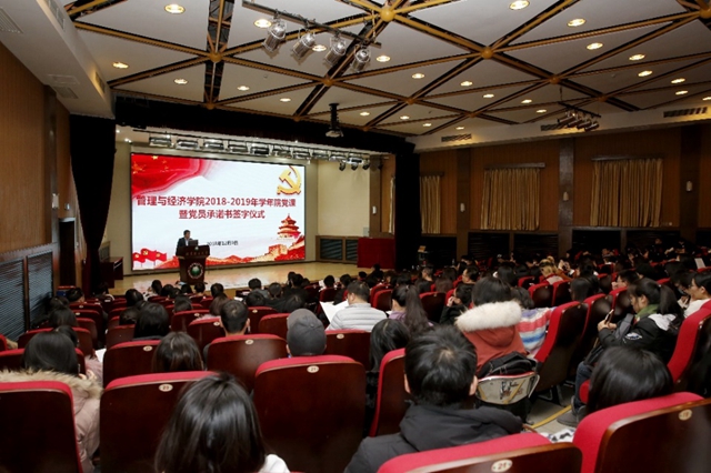 编辑:王笑竹 审核:王兆华 阅读次数:12月9日,管理与经济学院在七号楼报告厅举行专题党课暨党员承诺书签字仪式。学院党委书记王兆华及2018级全体研究生学生党员、预备党员、入党积极分子230余人参加了此次活动。