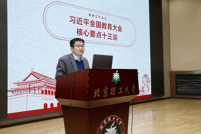 王兆华面向全体学生党员及入党及积分子以“深入学习全国教育大会、北京市教育大会精神”为题讲授党课。王兆华从党的十九大新部署以及学生培养目标展开解读,结合本院实际情况围绕教育深化体制改革等十三个方面向参会学生具体分析了全国教育大会及北京市教育大会的会议精神。他重点强调了新时期教育的改革发展中心必须牢牢把握“九个坚持”和“六个功夫”,在工作学习中,要时刻明确目标,稳扎实干,做好“坚持”,下好“功夫”。最后,他对全体学生党员提出了殷切希望,希望更多优秀的同学能够投身教育事业中去,为学校“双一流”建设作出应有贡献。