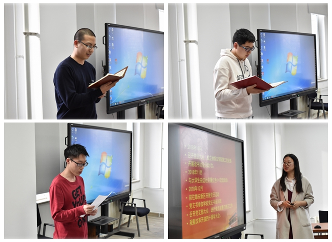 首先,举行了新发展预备党员入党宣誓仪式。伴随着雄壮的国际歌,在领誓人的带领下,13名预备党员面对鲜红的党旗,紧握右拳,以饱满的热情,洪亮的声音庄严宣誓,表明自己志愿为党和国家奋斗终身的坚定决心。孙心桐代表宣誓的预备党员发言,他激动地说:“我会永远铭记这一神圣而庄严的时刻,牢记党员的责任与义务,通过不断的努力成为一名优秀党员。”马克思主义学院张雷作为教师代表勉励同志们要牢记习近平总书记的谆谆教诲,不忘初心、砥砺奋进,勤奋好学、务实肯干,努力练就过硬本领。