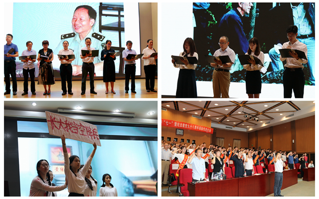 学院党政班子成员朗诵了全军新挂像英模林俊德院士事迹,师生党员代表朗诵了天眼之父南仁东事迹,学生团队表演了歌颂空降兵英勇形象的舞蹈《长大我当空降兵》。会议表彰了4个优秀基层党支部、8名优秀党支部书记、16名优秀共产党员。会议上,由学院党委书记金军同志领誓,42名新发展党员在党旗下庄严宣誓,全体党员同志重温入党誓词。