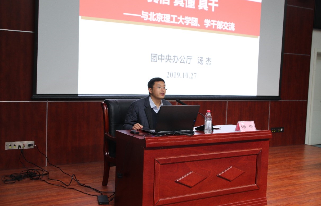 汤杰作了题为《真信、真懂 、真干》的辅导报告。他回顾了北理工参与国庆70周年庆祝活动的主要情况,分享了他眼中的北理工和北理工精神,鼓舞学生骨干传承红色基因,勇敢担负新时代赋予当代北理工青年的使命责任。授课过程中,他从青年信仰解读、青年工作理论、引导青年的方式方法出发,与同学们交流了怎样当好一名优秀学生骨干。他鼓励同学们牢记习近平总书记提出的“理想、爱国、担当、奋斗、学习、品德”六方面希望,从现在做起、从小事做起,努力求真学问、练真本领,不断奋发成长成才。