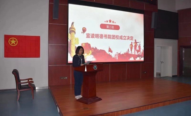 2019年9月,明德书院团委新增团员220人,根据《团章》基层组织建设相关要求,增设10个基层团支部,分别为德泽团支部、德远团支部、德祎团支部、德音团支部、德翊团支部、德曜团支部、德清团支部、德昭团支部、德正团支部、德懿团支部。明德书院副院长李冰为10个新生团支部授团旗,精工书院、睿信书院、求是书院以及人文与社会科学学院的专职团干部为新生团员代表授团徽。仪式的最后,全体到场人员重温《入团誓词》。