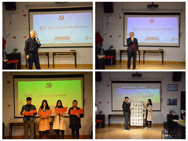 青年们的认真与热情,感染了在场的老党员们。原国家工信安全中心副所长、党委副书记陈启光和原国家工信安全中心海威数据负责人郭德瑜在交流发言中感慨,同学们的精彩演讲把他们的思绪带回到了过去,分享了他们见证建国大典、参与国庆10周年、20周年志愿工作时的故事。他们表示,青年们传承了红色基因,祖国未来可期。之后,同学们进行了《祖国颂》诗歌朗诵、并向老干部们献上自己写的书法作品。
