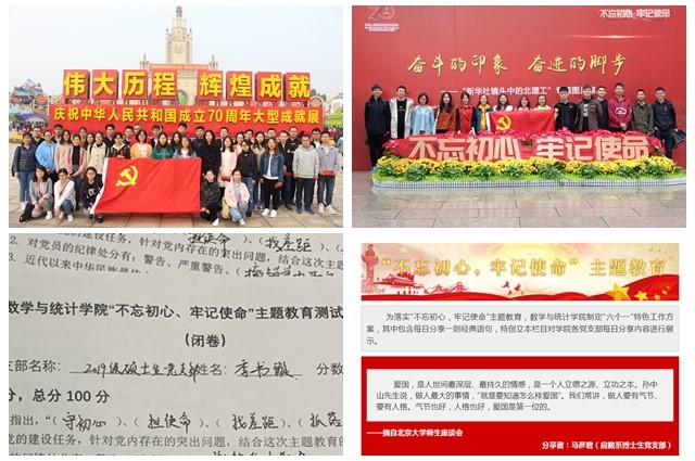 在主题党日中受洗礼。结合新中国成立70周年和校庆79周年的契机,各党支部开展了参观走访、观看影片、聆听报告等多种形式的党日活动。党委委员和机关党支部全体成员赴方山县与当地村党支部联合开展了“支部共学入心、专题党课聚焦、扶贫捐赠助力”的党日活动。数学系博士生党支部开展了“我的政治生日,映照初心使命”活动,为6名党员集体过政治生日,许下整改自身差距的“愿望”。统计与概率系博士生党支部等5个支部的党员参观了“伟大历程,辉煌成就——庆祝中华人民共和国成立70周年大型成就展”,在回顾党和国家发展历程及辉煌成果中,坚定信仰,树立“四个自信”。