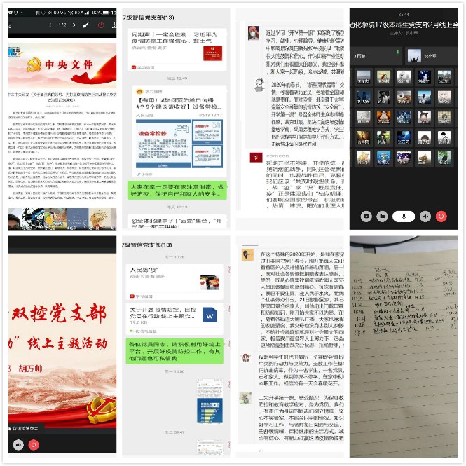 自动化学院党委结合当前疫情防控形势和工作任务,征求支部和党员意见,明确了2月份党日活动的主题、形式和内容。2月17日至29日,自动化学院26个学生党支部相继开展了“疫情防控·自控党员在行动”线上主题党日活动,学院全体学生党员459人分别在家中以视频会议、语音会议等形式参与活动,学院副书记、副院长邓方及各年级辅导员分别参加了不同支部的主题党日活动。