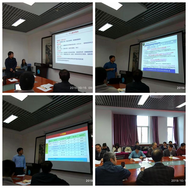 编辑:邵泽 审核:马壮 阅读次数:10月15日,材料学院工会主办的2019年下半年的材料学院“青年教师季”活动第一场考核初体验于顺利进行。材料学院工会青年委员蔡政旭组织了材料学院和前沿交叉科学研究院的青年教师在5号楼502会议室聆听了新体系教师聘期考核答辩,认真听取学习了教师在入职之后的教学科研工作上的经验。材料学院党委书记张青山、副院长马壮、副院长李树奎和院长助理陈棋等参加了活动。