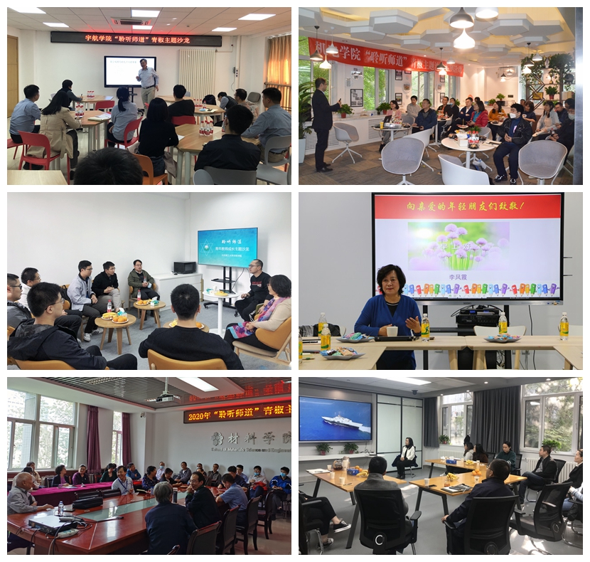 为引导广大教师争做新时代“四有”好老师和“四个引路人”,落实立德树人根本任务,弘扬爱国奋斗精神,营造尊师重教、爱国荣校的良好氛围,2020年,在疫情防控常态化背景下,党委教师工作部牵头组织,依托校院两级平台,开展了30余场线上线下相结合的“聆听师道”青年教师主题沙龙活动。活动聚焦青年教师群体,结合学校80周年校庆等重要活动,围绕青年教师关心的热点难点,开展交流研讨,帮助青年教师加深对职业的理解,助力青年教师快速成长。