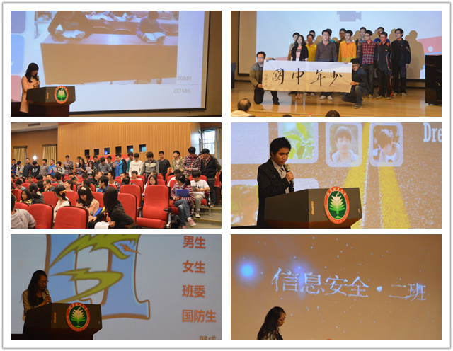 接下来是本科2011级软件工程三班团支部(08111103团支部)的班级代表胡亮同学。胡亮同学展示了本班同学学习、活动、成就等方面的视频,随后在台上通过讲述本班同学突出的学习成绩和多姿多彩的学生活动来进行展示本班的优秀风采,最后的互动环节大家通过朗诵一篇写给本班每位同学的文章做结,赢得了台下评委和老师们的认可。