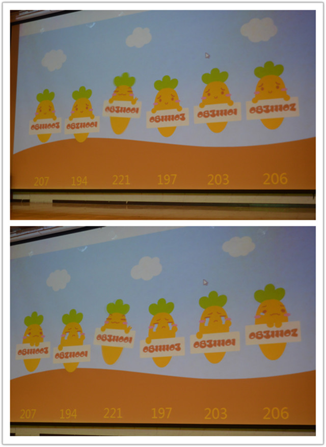 同学们在场下投票,大屏幕上实时显示了每个班级的得票情况,现场气氛一下子进入了白热化状态。一个个可爱的代表每个班级的小萝卜在不停的跳动,大家的心也伴随着票数的变化在砰砰砰的跳起来了。