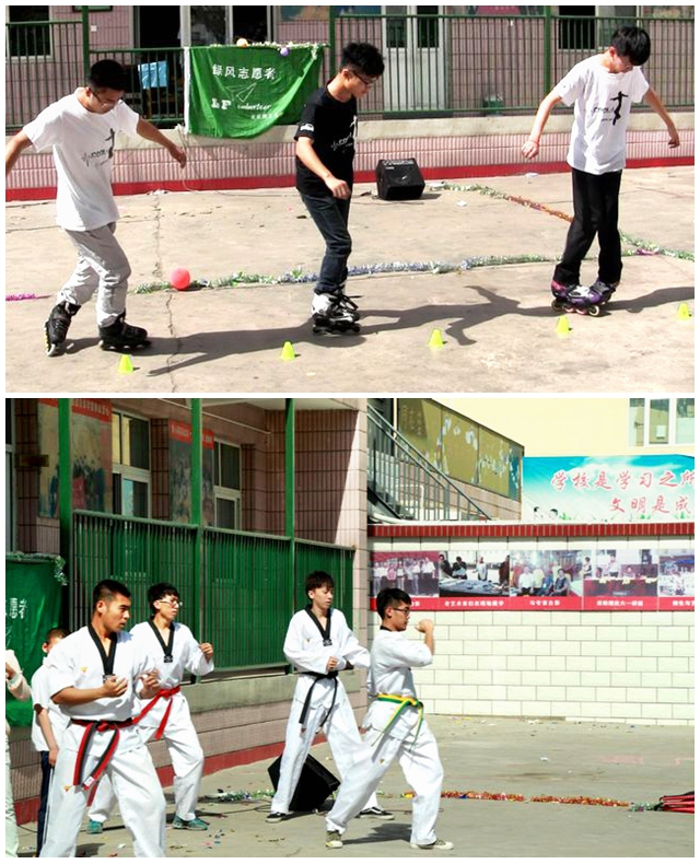 另外,为了给希望学校的孩子们带来一场不一样的联欢会,绿风还特别邀请了北京成品人和一品二品的区别“酷爱轮滑社”和“跆拳道协会”来参加我们的六一联欢会,这两个节目给会场带来了高潮,孩子们都被大哥哥大姐姐们精彩的表演所震撼,台下掌声雷动,经久不息。