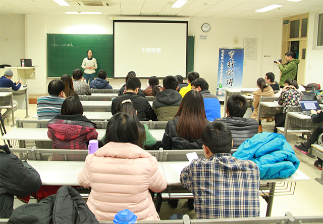 报告伊始,周雪以“相信往昔—迎接扑面而来的未知”为主题,将自己成长创业路上的经历娓娓道来。整场报告分为“小时候的北京时间”、“无数个榜样”、“自然的力量”、“四季创恒”、“只为普通”等几部分,讲述了她小时候患软骨症,由绝望到充满信心,最终痊愈并取得今天成就的经历。周雪以坦诚、朴实的语言感动了到场的每一位同学。说到自己创办的北京四季创恒文化传媒公司,周雪说“我有一个梦想,就是为我们普通人做一些事情,关注普通人的生活。”