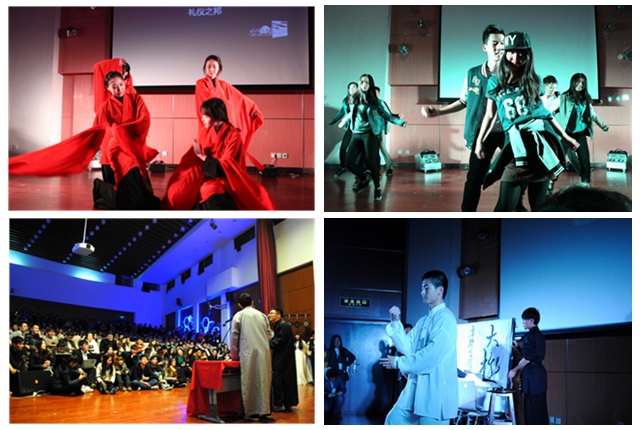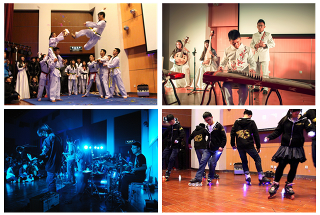 随后,社团表演正式亮相,从黑白漫画社炫酷搞笑的《时光 未央》,到相声社爆笑的《出口成章》,到飞娆古风社唯美的《礼仪之邦》,逐渐将气氛推向高潮;武术协会和无阳斋书画社联合呈现的《笔墨武林》,以入木三分的即兴书法为背景,行云流水地展现了传统武术的柔风劲骨,同时,特邀峨眉拳大师及弟子现场演示的峨眉拳,让同学们领略到了武术的极致魅力;乡琴协会一曲《Rocking your heart》狂野摇滚,让大家的心都似乎跟着节奏跳动;抖之道空竹社《空竹炫舞》让抖动的空竹舞出了绚丽和华美。