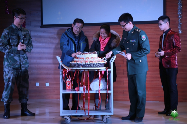 最令人感动与惊喜的,是晚会预设的神秘环节。选培办为大家准备了生日蛋糕,这是对国防生元旦晚会十周年的献礼,象征着历届国防生的成长和进步,同时也饱含了对所有在校国防生美好未来的祝福。秦主任、许副处长与国防生家长代表亲自为大家切分蛋糕,寓意每一名国防生的成长都离不开选培办领导、学校领导和学生家长的关怀与培养。秦主任赞扬了国防生牢记使命、不负重托的精神,肯定了2015年国防生完成的各项任务,并鼓励全体国防生为了心中的梦想刻苦奋进,努力打造北理工国防生品牌。学生工作处副处长许欣老师称赞了国防生敢为人先的良好形象,激励大家在学校努力学习、做好榜样,在部队建功立业、成为栋梁。2015级国防生金哲毅的父亲金连柱代表国防生家长对选培办与学校的辛勤培育表示感谢,对国防生的茁壮成长寄予厚望。