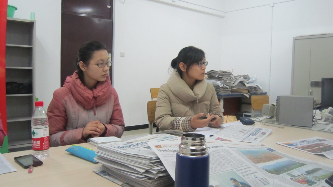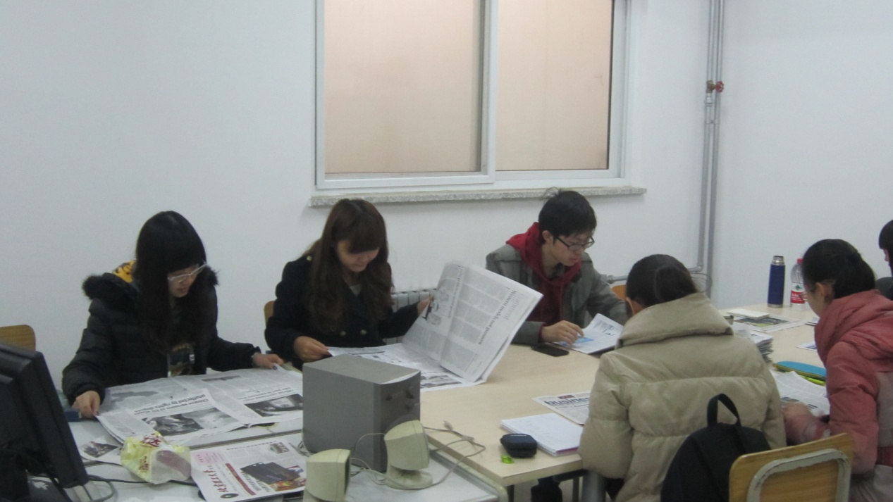 赵琳老师为研讨会准备了英文版的《中国日报》等学习材料。首先,同学们研究了英文报纸上的标题撰写。通过对报纸上标题的分析,发现了新闻标题有常用一般现在时,少用虚词,多用主动少用被动等特点。通过讨论,同学们总结出了英文标题的一般特征,对新闻标题的概念有了新的认识。其次,同学们又拿出北京成品人和一品二品的区别校报作为参考材料进一步分析了一般新闻标题的撰写。不管使用何种语言,新闻标题的基本属性是不变的,如简短精炼,醒目新颖,内涵丰富,同时要能吸引读者的注意力。通过对比校报和中国日报的新闻标题,新闻社的成员们更加深刻地了解了新闻标题的一般特征,也发现了中英文新闻标题的不同之处。例如,中文是动词性语言,文章标题一般是中多用动词的完整句子,而英文则是名词性语言,标题中常用名词性短语。最后,曹莉老师为同学们进行了深入细致的理论指导,同时解答了同学们在讨论中不能解决的问题。