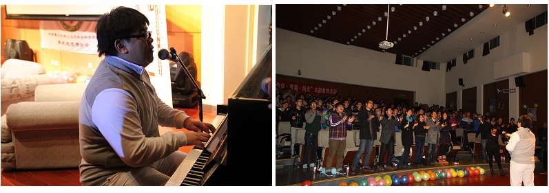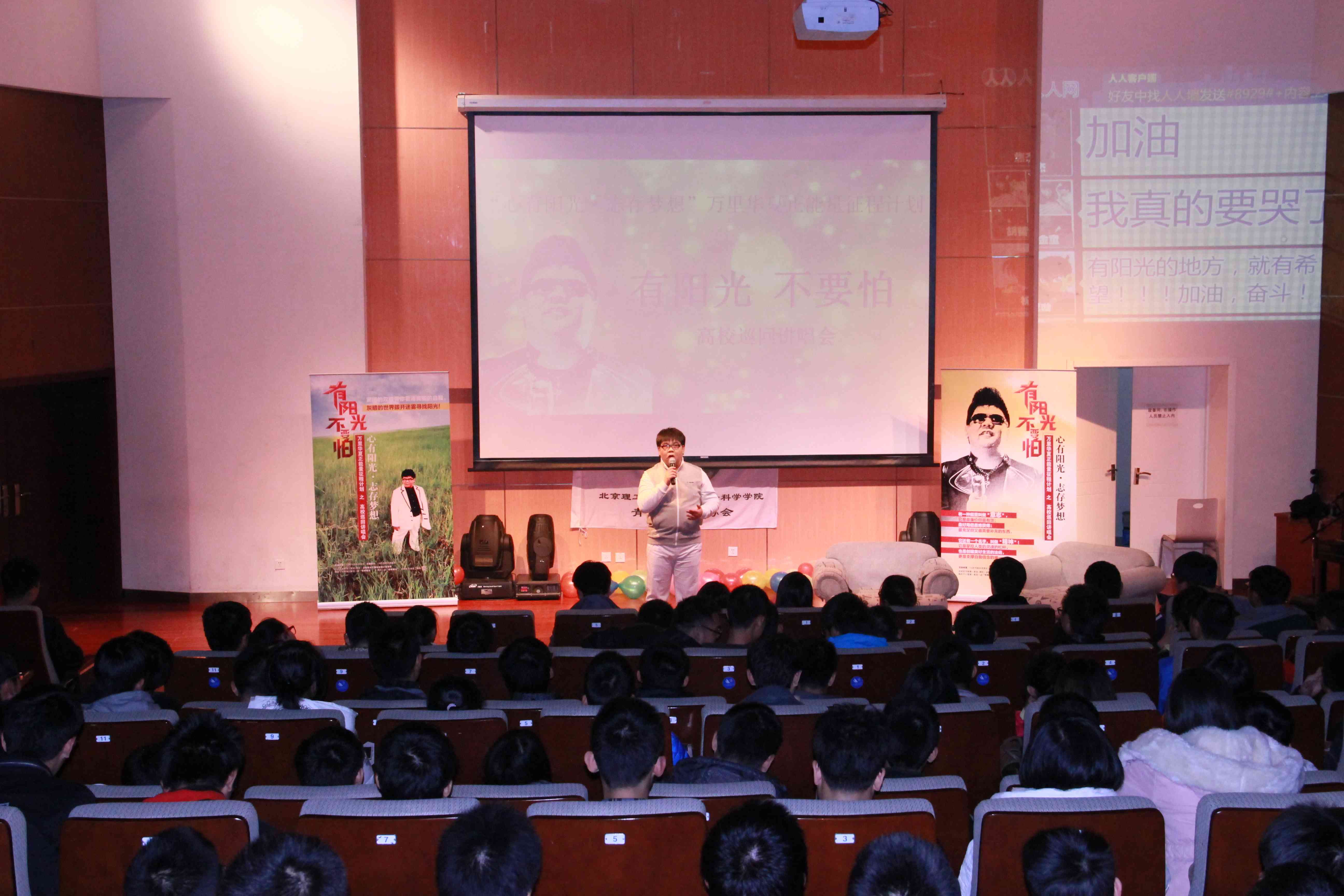 2013年11月26日晚,由人文学院分团委主办,人文学院青年志愿者协会承办的“有阳光,不要怕”盲人歌手杨光励志讲唱会暨“信仰 青春 阳光”教育活动在良乡校区综教演艺厅唱响。参加本次晚会的有外国语学院老师周芳集,化学学院老师王绍辉,数学学院老师孙红权、宫婷,管理与经济学院老师陈铮、赵航,设计与艺术学院老师陈丽健,人文与社会学院老师于满,全校各专业300多名学生参与其中。