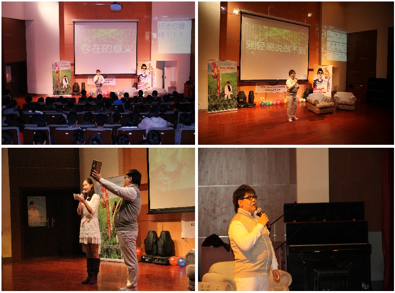 活动现场,杨光还请来了表演嘉宾。首先在“别轻易说做不到”板块请上场的是有“大陆机智王”之称的张地。张地分享了他出生贫穷家庭,但通过努力和对音乐的热爱,而登上大舞台的经历,他与同学们积极互动,现场改编歌曲巧妙回答同学们的问题,引来现场掌声不断。之后在“珍惜所有”环节,杨光请上了在汶川大地震中不幸双腿截肢,但依然乐观坚强唱歌的李应霞,她用她的故事和弹唱给现场带来了满满的“正能量”,同学倍受鼓舞。