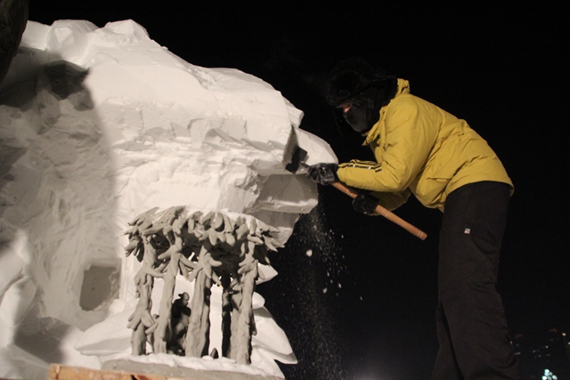 第二天进行的工作是基础造型,对作品中的竹叶、小鸟等细部进行雕刻,在塑形过程中发现不合理的地方,同学们还要随时修改、随时调整。制作雪雕的过程是一个做减法的过程,因此塑形的过程面临着各种困难,其中最大的困难是注意力必须要非常集中,绝不能有丝毫差错,若雪块一旦雕错,就无法重新再来。在初期雕刻竹叶时,同学们估算错了叶子的承受能力,竹叶出现了断折的情况,而唯一的补救方法就是在原有基础上缩小竹叶的尽寸重新雕刻。精雕细刻见匠心,长达十多小时的连续工作中,同学们戴了两层手套的手冻到没有知觉,手套一次次地湿透又一次次被寒风吹干。雕磨到一半时,同学们发现手中的工具开始变钝,这时队员李雨璇和蒋亦希两位女生自告奋勇地表示要前去找磨刀铺将工具打磨锋利。这是哈尔滨四点半的天空,但仿佛已像是深夜,在人生地不熟的异乡,两位女生扛着沉重的铁器开始四处寻找磨刀铺。三个小时后,她们终于成功将磨利的刀子交到同伴们的手上。垂垂夜幕,阴霾天空,同学们还在马不停蹄地赶工,事实上雪雕制作中的很多工作是只能在晚上进行,夜晚时雪的粘度会因为温度降低而增大,这为雪雕细节的修改和塑性创造了有利的条件。可是晚上的气温特别低,同学们往往工作一会儿就冻得浑身发抖,只能靠照明灯泡发出的热量取暖、烘烤手套。夜晚回到宿舍,大部分同学累得倒头就睡,这时队长周谷川悄悄地拿起热水瓶下楼为同学们打洗脚水,这一幕被细心的李晓龙看到了。第二天当李晓龙想起帮助同伴们打水时,发现暖瓶已经被周谷川抢先拎走了。事实上,这种“我为人人,人人为我”的事情每天都在发生,参赛的每个同学都看在眼里,感动在心里。