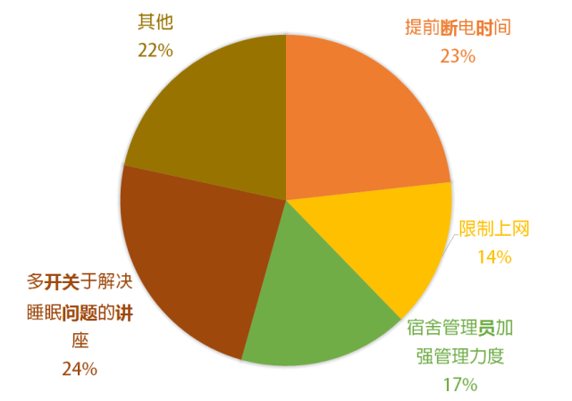 同学们的生活学习离不开学校构建的和谐环境和有效管理,通过“你认为学校对于保障学生睡眠质量还可以做哪些改进?”这一问题的调查反馈,很多同学纷纷提出了自己的建议。根据反馈数据(图七)显示,33%的同学支持学校提前断电时间,20%的同学希望学校限制上网,23%的同学希望通过加强宿舍管理员的管理力度来强制自己包括室友提早入睡。除了这些带着些“强制性”色彩的措施外,还有33%的同学希望学校开设一些关于解决睡眠问题的讲座,更好的了解睡眠的重要性,调整自己的睡眠问题。另外一些“合理地安排课程和考试周期”、“按同学睡觉时间分配宿舍”和“晚上提前半小时下课”等建议,也从某个角度反映了同学们的想法。