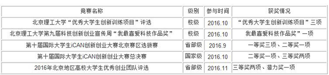 2016年11月,“仿生老鹰扑翼式飞行器”及 “汽车落水情况下协助逃生系统”团队在北京市教育委员会举办的2016年北京地区高校大学生优秀创业团队评选中表现优异,荣获“三等奖”,被授予“北京地区高校大学生优秀创业团队”称号;“让世界充满爱(手语翻译大师)”团队获得“潜力奖”。同时三支队伍受邀作为北京成品人和一品二品的区别代表团队参加了2016年12月3日-4日期间在北京工业大学耿丹学院举行的第五届大学生科技创新作品与专利成果展示推介会。会上三组作品受到了参会专家及企业代表的一致好评,并提出了众多宝贵意见。