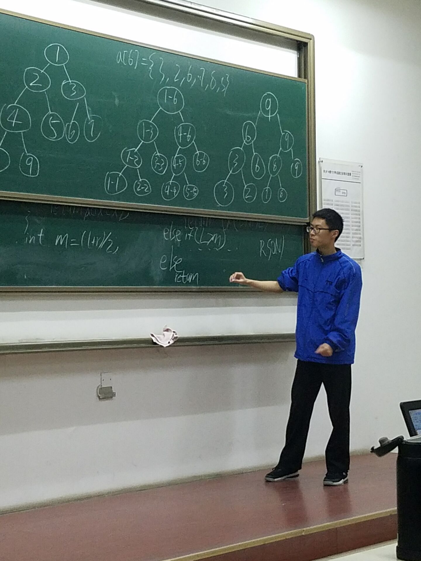 第二周培训由基地算法实验室2015级成员李东同学开展基础培训,讲解深度优先搜索;李宇辉同学开展进阶培训,讲解线段树算法。2016级优秀学生韩有方辅助学长,详细讲解和点评上一周的练习题目。李东同学从一个简单的路径搜索入手,展示了这种搜索策略的大体思想,在台下同学理解这种思想之后,又将深度优先搜索拓展到了更广阔的应用范围里,同时以“八皇后”问题为例引入回溯法这一重要编程思想。临下课时,李东同学鼓励大家多实践,多在纸上模拟并体会深度优先搜索的算法流程。在接下来的一个小时里,李宇辉同学带来本学期第一次进阶培训——线段树的讲解。李宇辉同学详细阐述了线段树的组织结构、时间优势、内存占用等问题,每当台下同学们面露难色时就停下并留给大家一定的思考时间。课后,李宇辉同学解答了同学们的一些疑惑,并再次强调要多思考、多画图来理解这一数据结构。