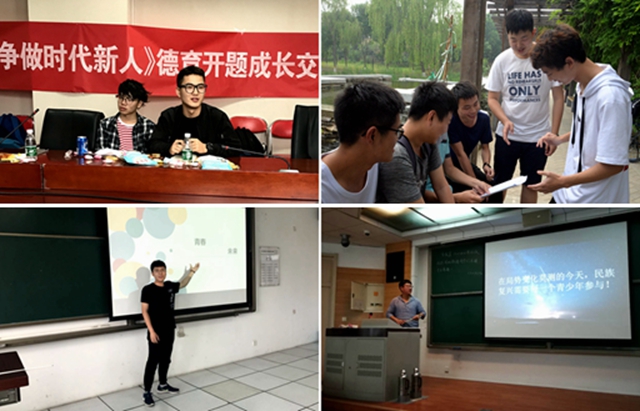 各班级在“启航青春之梦,争做时代新人”这一主题下,分别结合班级特色进行活动的形式创新,03911701班级将活动的地点选在了朝阳公园,同学们通过制作思维导图进行展示,系统地阐述自己大学的具体目标和做法;03041704确定了“少年心事当拿云”的交流会主题,鼓励同学们树立雄心壮志;03041708班级要求各同学以一个“关键词”总结自己的目标或想法并让每位同学在开题前把关键词写在横幅上进行留存;03041711班级让各位同学在纸条上手写自己的“中期小目标”并将全班同学的目标留存在一个“漂流瓶”中等德育中期的时候再发放给各位同学从而寻找差距,制定新的目标;03041711班级前期联系各位家长,让家长录制加油视频并在德育开题现场播放,让各位同学倍感亲切。此外,各班都制作了《我的青春梦》视频合辑,以视频的形式记录每位同学对于“时代新人”的理解以及自己的“青春梦想”。