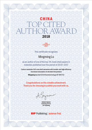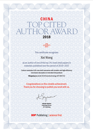 日前,材料学院曹茂盛教授收到英国皇家物理学会(IOP)发来的贺信,其指导的博士生卢明明和王希晰以共同第一作者身份发表在Nanotechnology(2016, 27, 065702)的文章“Carbon nanotube-CdS core–shell nanowires with tunable and high-efficiency microwave absorption at elevated temperature”入选“2018年英国皇家物理学会(IOP)高被引作者奖 (中国)”,IOP出版集团向获奖论文通讯作者和两位共同第一作者颁发了荣誉证书,这是英国皇家物理学会(IOP)首次授予中国科技工作者此项荣誉。