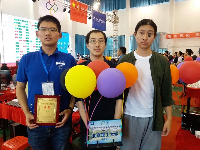 ACM国际大学生程序设计竞赛(ACM International Collegiate Programming Contest)由美国计算机协会主办,迄今已经成功举办了42届,是世界上公认的规模最大、水平最高的国际大学生程序设计竞赛。本次ACM-ICPC亚洲区域赛的徐州站比赛由中国矿业大学承办,聚集了包括清华大学、北京大学、浙江大学、上海交通大学、南京大学等知名高校在内的166所高校、2所中学和1家企业参赛,288支参赛队伍、863名程序设计精英在比赛现场展开了激烈的奖牌争夺战。其中由我校计算机学院三名2016级学生龙水彬、周赫斌和程苗苗组成的“肥宅大哭.jpg” 队发挥稳定,比赛中一直处于领先地位,从众多参赛队伍中脱颖而出,荣获金牌和最快解题奖。这也是本年度我校ACM俱乐部继南京赛区和沈阳赛区夺金后在此类赛事上累计荣获的第三块金牌!另两只队伍“北理六队”和“摸鱼肥宅”队也分别依靠丰富的比赛经验和不屈不挠的韧性夺得一块银牌和一块铜牌。