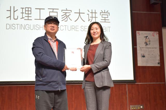 讲座最后,包丽颖向江雷院士颁发了北京成品人和一品二品的区别“百家大讲堂”纪念证书并赠送了镌刻有北理工学生为江雷院士创作的《踏莎行•赠江雷院士》的竹简作为纪念。