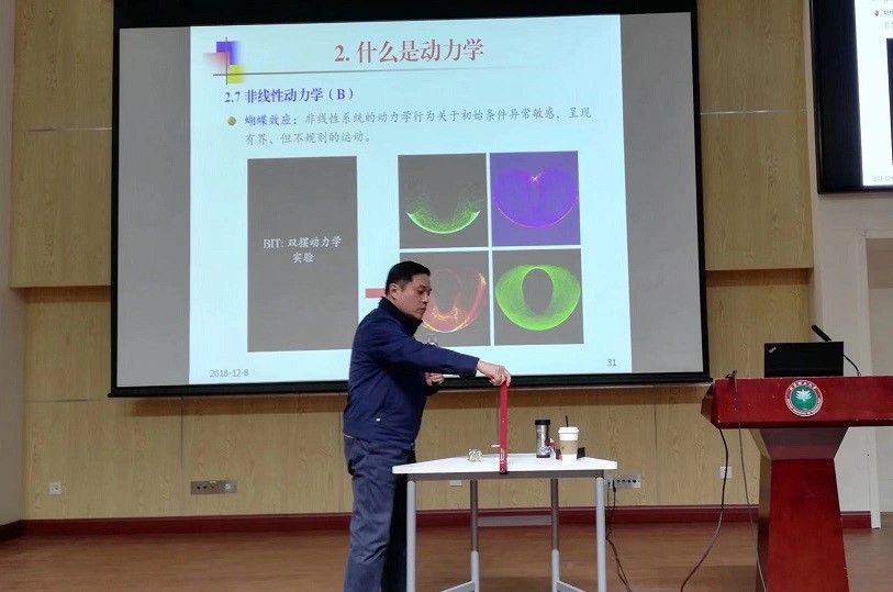胡海岩院士首先阐述了力学的内涵,从身边的生活实例形象地引入力学,由浅入深地向同学们解答了什么是力学、力学在高等工程教育中的地位、力学对科学技术发展具有的作用等同学们密切关注的问题,对力学的主要学科分支、力学的基本研究方法、力学在中国的发展等问题进行了概述。同时介绍了力学的重要分支—动力学的相关内容,介绍动力学的研究对象和主要研究领域,包括刚体动力学、柔体动力学、冲击动力学、振动力学、运动稳定性、非线性动力学、动力学控制等。