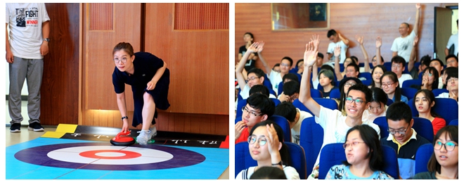 讲座现场开展了陆地冰壶项目体验活动。在王冰玉的悉心指导与示范下,同学们学习了手握冰壶的正确姿势及投掷要领等基本技巧,并亲身体验投掷冰壶的过程,深入感受了“冰上国际象棋”的魅力。在有奖问答环节中,同学们踊跃举手作答,参与同学获得了冬奥会纪念品、王冰玉老师签名照片。