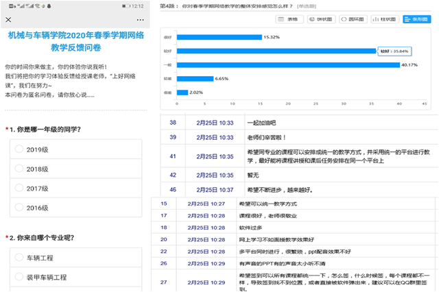 编辑:刘芳熙 审核:冯慧华 阅读次数:“第一次直播授课,全班46名同学全部准时进入课堂”“第一次网课,授课、图文声交流相当完美”“远程教学第一次上课,打卡签到情况不错,圆满”,这是机械与车辆学院胡耀光、李莉、何永熹老师在朋友圈内分享的第一周网络授课的体验。类似这样的分享还有很多,简短的文字、简单的言辞背后是老师门倾心教学的全力付出,收获的是“网络教学战役”首战的初步告捷。