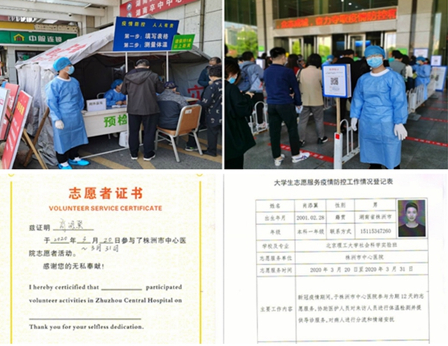 “青春,在党和人民需要的地方绽放”明德学子肖添翼在湖南省株洲市中心医院贡献出自己的一份力量。他时刻铭记自己北理工学子的身份,深入战疫前线,进行志愿服务时将我校“实事求是,不自以为是”的学风付诸实践,勤学好问,在协助导诊、安抚病患等方面表现优异,获得院方高度认可。