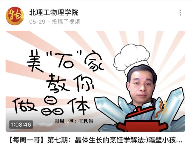 “响应号召,排一个。”物理学院教师群里时不时会蹦出这样一条消息,这是学院专业教师报名“每周一哥”栏目的场景。虽然手头还有课题要忙,实验安排也是满满当当,但这丝毫没有削减物理学院专业教师们参与科普工作的热情。在直播中,他们化身科普“主播”,量子力学、纳米剪纸、等离子体等物理学前沿内容呈现在观众面前,老师们诙谐幽默的讲解搭配着精心准备的PPT,再加上饶有趣味的后期剪辑风格,寓教于乐,使得栏目深受观众喜爱。一些领航中学还将“每周一哥”系列科普视频作为学校“第二课堂”“双创教育”的学习课程面向学生播放。活动在发挥科普作用的同时,也提高了学校知名度和物理学科美誉度。