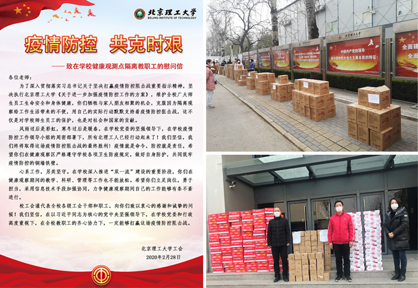 在疫情肆虐、武汉告急的重要时刻,2月2日,在校工会的倡议下,各基层工会积极响应,组织本单位教职工通过北京市温暖基金会“温暖武汉”项目进行网上捐赠。广大教职工积极响应,踊跃捐赠,部分二级工会的捐赠率达到了100%。2月28日、3月25日,校工会领导两次来到学校疫情防控健康观测点,看望慰问一线工作人员和在此隔离观察的100余位教职工,为他们送去牛奶、水果、方便面等物品。此外,校工会还为工作在疫情防控一线的医务、安保人员等单独拨付了防控补助1.5万元。