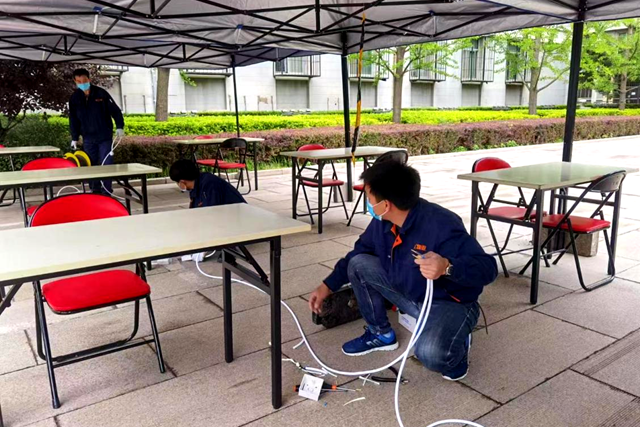 “接到临时通知,根据属地政府部门有关要求及学校疫情防控工作领导小组统一安排,明早9点,还要继续进行一轮全员核酸检测……”电话铃声突然响起,打破了黑夜的沉寂,后勤服务公司各部门闻令而动,沟通部署。早上5点天刚亮,师傅们就开始搭建核酸检测帐篷、接通临时电源、布置桌椅、设置隔离带、铺设两米线、运送防护服、咽拭子试管等相关物资……一项项工作井然有序。