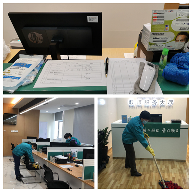 春节后,大厅恢复开放前一天,物业保洁人员进行了全面清洁和消毒工作,开放期间每天也将进行至少两次消毒;为加强值班人员个人防护,中心每天向每位工作人员发放口罩、一次性手套、鞋套等防护物资,做好体温检测和登记;中心要求办事教职工必须正确佩戴口罩,并做好体温检测、人员身份认证和登记工作。通过全方位防控,有力保障全体工作人员和办事人员的健康和安全。