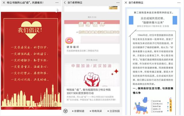 学院启动“众志成城 共克时艰—特立学子在行动”网络主题教育,发布同心战疫“六个一定”倡议书,并依托学院公众号“BIT卓然特立”、各年级QQ群等网络平台开展一系列防疫相关活动。在思想引领方面,组织全体学生在线集体学习“开学第一课”,分团委组织23个团支部共同开展“同心战疫”线上主题团日活动,引领全体团员青年安居简出、科学防护,理性战疫、杜绝谣言,珍惜韶华、勤学不辍,爱劳重卫、强健身心,令行禁止、要情即报,同心战疫、共克时艰,模范落实“不返京、不返校、不离家、不流动”要求,携手打赢疫情防控的人民战争总体战阻击战。