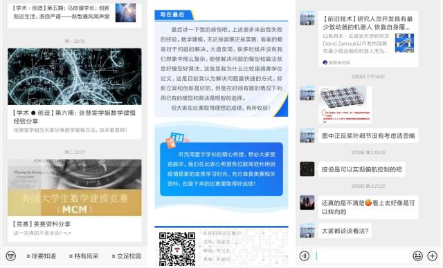 学院组织往届学术论坛优秀论文作者、往届美国数学建模大赛获奖学生、往届世纪杯获奖作品作者分享自己在学术论文、学科竞赛、科技创新方面的成果经验,以《学术·创造》《竞赛》等连载网络推送为经验交流窗口,为即将到来的徐特立学院第三届学术论坛、美国数学建模大赛、第十七届“世纪杯”竞赛进行线上动员与培训,并邀请相关老师建立在线学习交流群,为同学们答疑解惑。