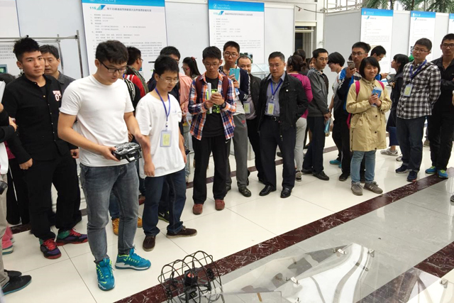 “鼠笼式无人机”在展会当天受到了来自国内外参会人员的肯定和支持。该作品由自动化学院学生自主研发,是国内首次将外部鼠笼框架与内部四轴八旋翼结构相结合的新型陆空两栖无人机。作品主要应用于管道、山洞等复杂狭小空间的探测活动,在军事和民用领域均有一定的推广价值和广泛的应用前景。