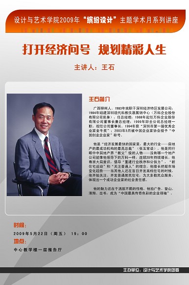 设计与艺术学院2009年“缤纷设计”主题学术月活动,将于5月22日(周五)晚七点,在中心教学楼一层报告厅,邀请著名企业家,深圳万科企业股份有限公司董事长王石先生,为我校师生做题为“打开经济问号,规划精彩人生”的专题讲座。欢迎广大师生参加。