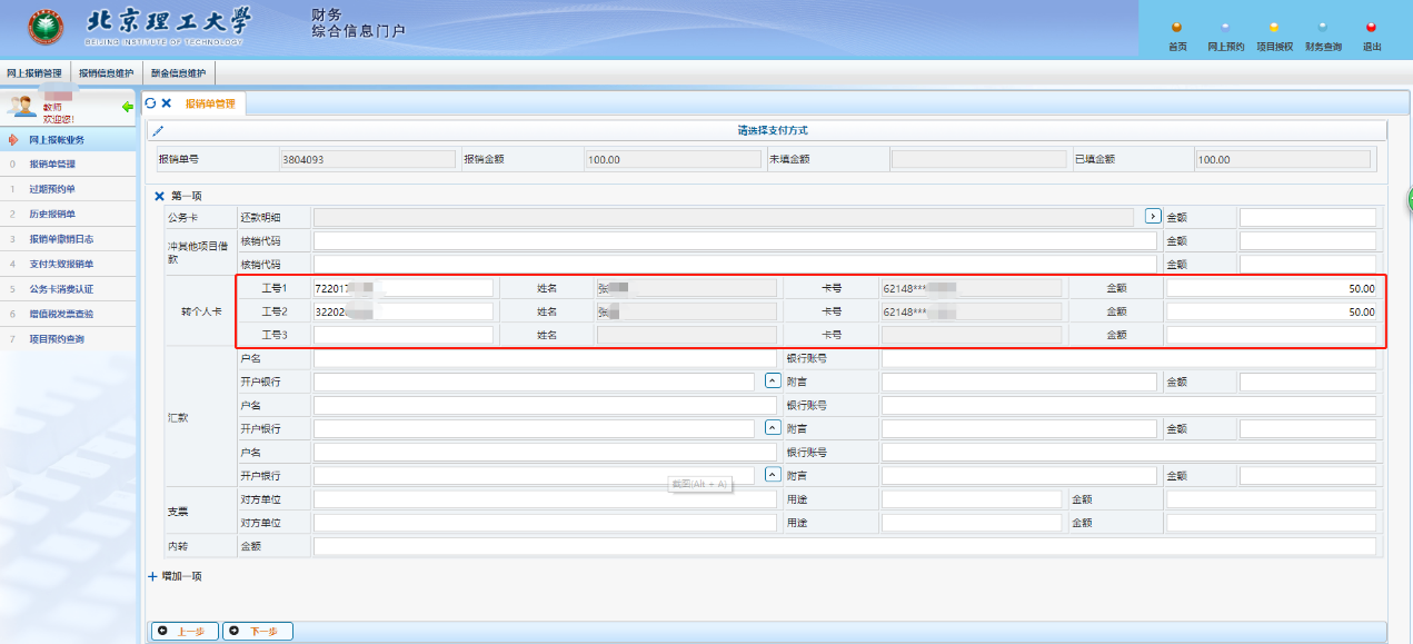 即日起,登录高级财务管理平台预约报账时,在“选择支付方式”界面直接填入学生学号或劳务派遣人员工号,报销成功后,款项直接进入其招商银行卡(该卡为学生专门用于划扣学费的招行卡、劳务派遣人员专门用于领取工资的招行卡)。