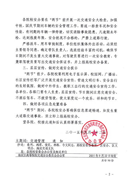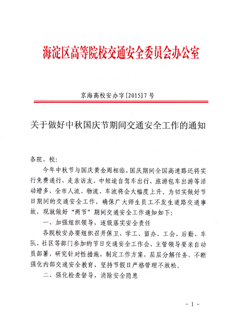 根据海淀区高等院校交通安全委员会办公室《关于做好中秋国庆节期间交通安全工作的通知》(详见附件)要求,为切实做好节日期间的交通安全工作,确保广大师生员工及家属区居民不发生道路安全事故,请各学院、部、处在“两节”期间做好以下工作:
