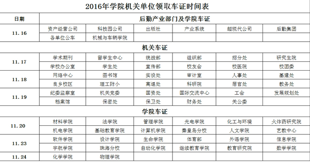附件:2016年学院机关单位领取车证时间表