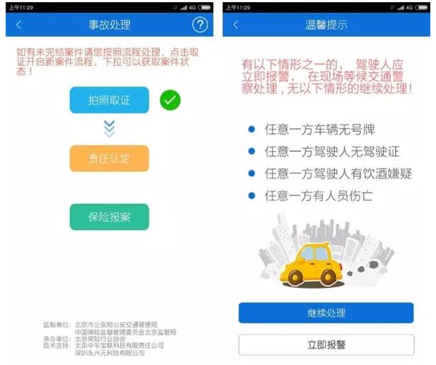 “事故e处理”模块已于2015年11月率先上线应用。发生交通事故后,当事人可通过APP拍照完成自主取证;通过自行协商或交警远程指导完成责任认定;通过APP完成在线保险理赔报案。交警部门和保险部门可以通过官方平台共享事故信息。目前北京交警APP中的“事故e处理”模块是2.2版本,较之前的2.1版本增加了视频取证、当事人信息二维码自动识别以及驾驶证、行驶证信息部分验真功能(软件注册时填写个人信息后才可以完成验真)。原“事故e处理”手机APP升级后,自动变更为北京交警APP。通过软件的不断升级更新,力求为当事人提供更便捷和更人性化的服务。
