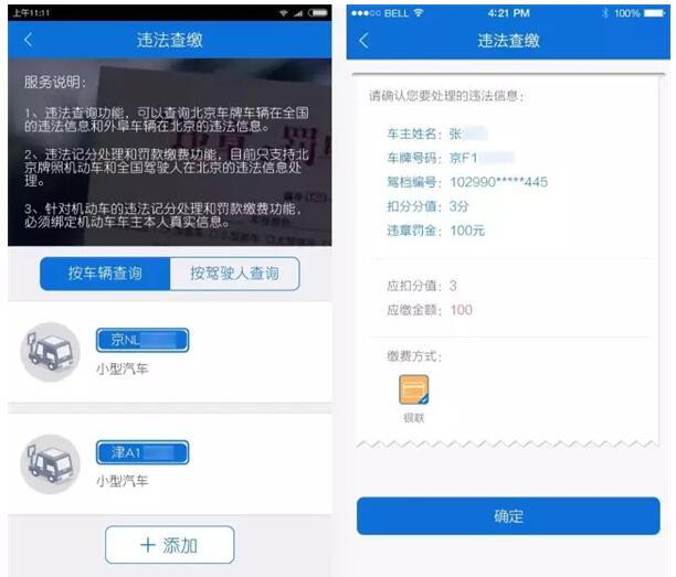 首期上线的交通违法查询、交通违法缴费板块已合并成“违法查缴”。通过交通违法查询模块可以查询北京交管部门核发驾驶证的驾驶员在全国的交通违法信息和外埠交管部门核发驾驶证的驾驶员在北京的交通违法信息,以及京牌机动车在全国的交通违法信息和外埠机动车在北京的交通违法信息。交通违法查询可以由用户通过APP主动发起查询,也可以通过订阅功能实现交通违法信息主动推送。交通违法缴费模块提供机动车交通违法行为自助处理及缴费和驾驶员交通违法缴费功能。用户在使用交通违法处理与罚款缴纳时需要绑定机动车车主本人真实信息。其中交通违法处理支持北京交管部门核发驾驶证的驾驶员自助处理本人名下京牌机动车的非现场交通违法行为,并进行缴款。同时,驾驶员已扣积分和此次欲处理交通违法记分之和小于12分,且罚款金额在200元以内(含)的交通违法行为才可进行在线违法处理。值得一提的是,为进一步方便群众缴费,此次交通违法缴费实现了支持所有银联卡的手机在线支付。