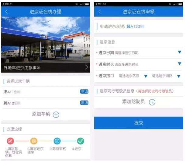 通过进京证办理模块,进京驾驶员可提前1-4天在线申请办理进京通行证,申请成功后可获得具有二维码的电子进京证。办证过程中,申请人需填写驾驶员、进京车辆及相关进京信息,并上传相关证件照片。系统后台审核完毕后,通过APP消息的形式通知申请人审核结果。电子进京证的效力与实体进京证相同,其有效期为2至7天,用户可根据进京行程自行选择。群众办理成功后可根据提示自助打印纸质版进京证。目前,进京证办理程序属于试运行阶段,群众如网上办理不成功,仍可到原有进京检查站办证窗口办理。相比之前在窗口办理进京证,电子进京证的推出可减少因办证产生的出行,同时节省群众排队等待办证时间。在此需要提示的是:1、目前只允许外地小客车网上办理电子进京证,其它车辆仍需到检查站办证窗口办理。2、电子进京证与实体进京证在同一时段内无法重复办理。3、电子进京证无法在城区安监窗口续办。4、目前,电子进京证一旦申请成功,无法更改日期。